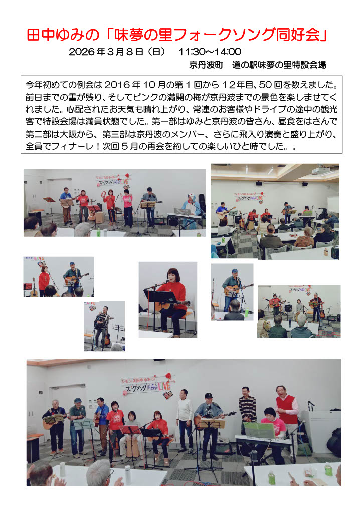 私「田中ゆみ」としては毎月の「うたごえゆみ」、京丹波味夢の里での「フォークソング同好会」、東京、埼玉での演奏ツアー。