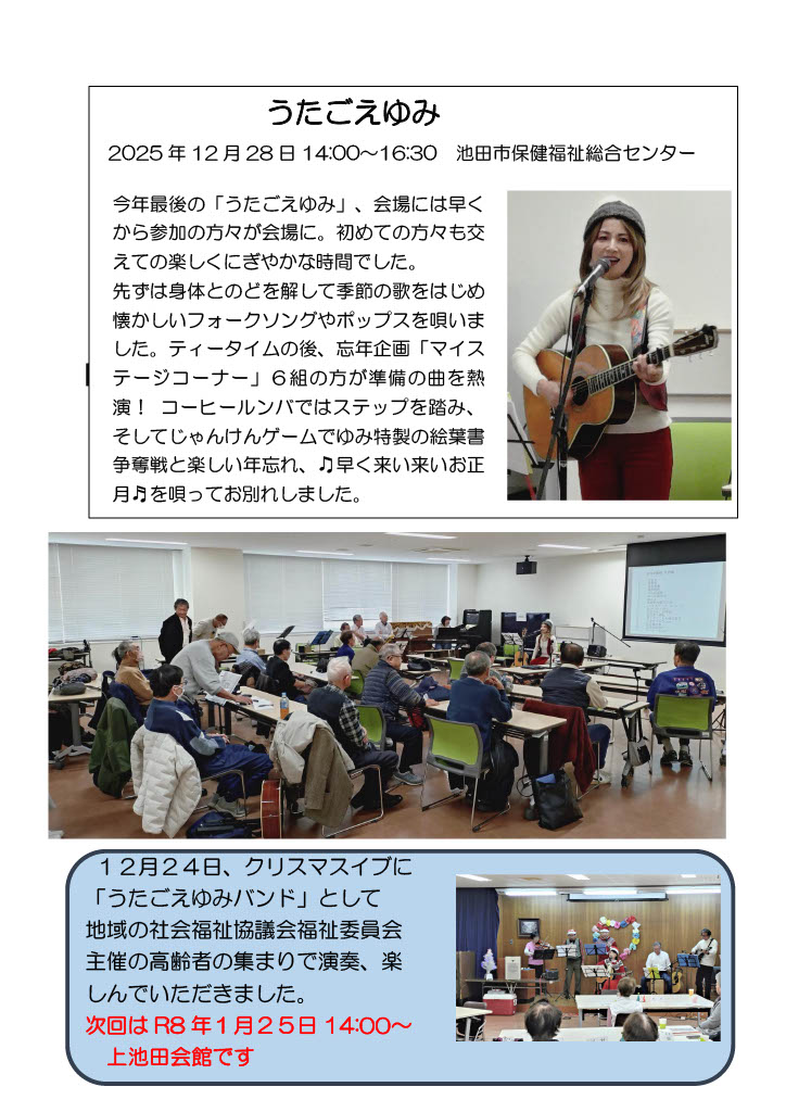 私「田中ゆみ」としては毎月の「うたごえゆみ」、京丹波味夢の里での「フォークソング同好会」、東京、埼玉での演奏ツアー。